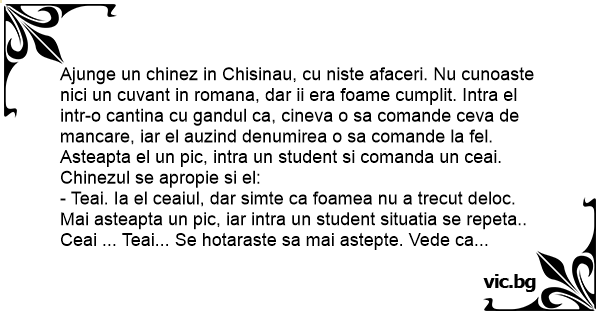 Ajunge un chinez in Chisinau, cu niste afaceri. Nu cunoaste nici un cuvant in romana, dar ii era foame cumplit. Intra el intr-o cantina cu gandul ca, cineva o sa comande ceva de mancare, iar el auzind denumirea o sa comande la fel. Asteapta el un pic, intra un student si comanda un ceai. Chinezul se apropie si el: