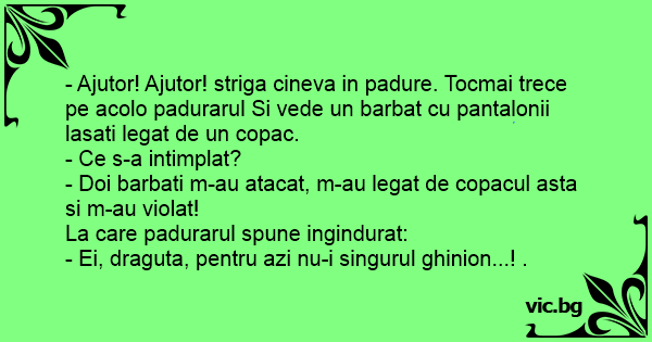 - Ajutor! Ajutor! striga cineva in padure. Tocmai trece pe acolo padurarul Si vede un barbat cu pantalonii lasati legat de un copac.