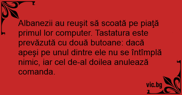 Albanezii au reuşit să scoată pe piaţă primul lor computer. Tastatura este prevăzută cu două butoane: dacă apeşi pe unul dintre ele nu se întîmplă nimic, iar cel de-al doilea anulează comanda.