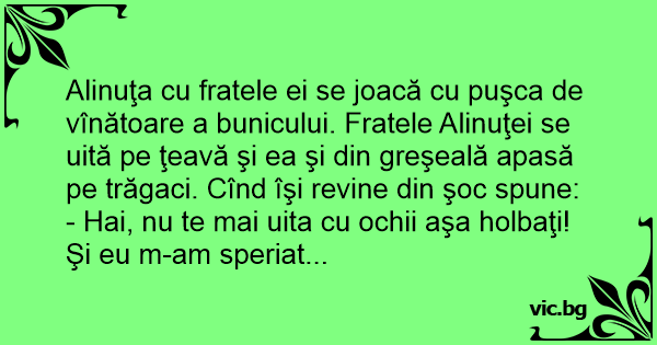 Alinuţa cu fratele ei se joacă cu puşca de vînătoare a bunicului. Fratele Alinuţei se uită pe ţeavă şi ea şi din greşeală apasă pe trăgaci. Cînd îşi revine din şoc spune: