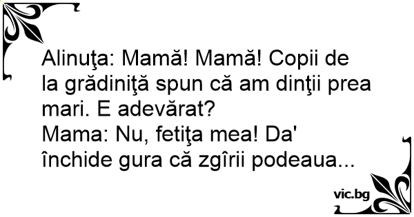 Alinuţa: Mamă! Mamă! Copii de la grădiniţă spun că am dinţii prea mari. E adevărat?