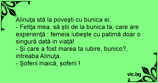 Баба учи младата си внучка: - Запомни, дете мое! В живота всяка жена трябва да има само една истинска любов! - А ти имала ли си, бабо? Обичала ли си някого така? - М-м-м-м... да, дете мое... Моряците...