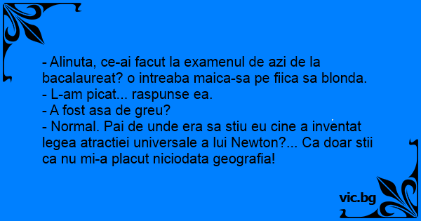 - Alinuta, ce-ai facut la examenul de azi de la bacalaureat? o intreaba maica-sa pe fiica sa blonda.