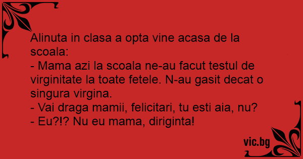- Mama azi la scoala ne-au facut testul de virginitate la toate fetele. N-au gasit decat o singura virgina.