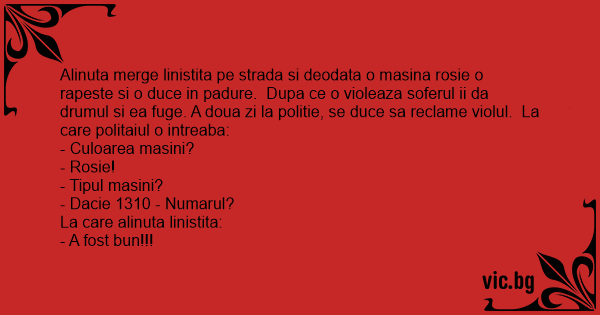Alinuta merge linistita pe strada si deodata o masina rosie o rapeste si o duce in padure. Dupa ce o violeaza soferul ii da drumul si ea fuge. A doua zi la politie, se duce sa reclame violul. La care politaiul o intreaba: