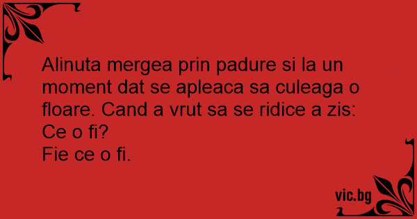 Alinuta mergea prin padure si la un moment dat se apleaca sa culeaga o floare. Cand a vrut sa se ridice a zis: