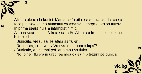 A doua seara la fel. A treia seara Pe Alinuta o trece pipi. Ii spune bunicului: