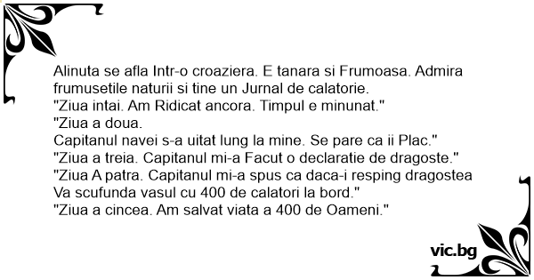 Alinuta se afla Intr-o croaziera. E tanara si Frumoasa. Admira frumusetile naturii si tine un Jurnal de calatorie.