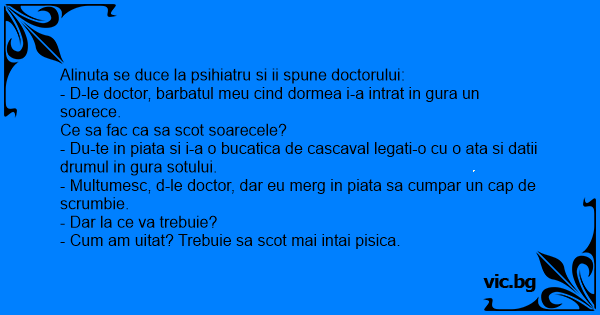- D-le doctor, barbatul meu cind dormea i-a intrat in gura un soarece.