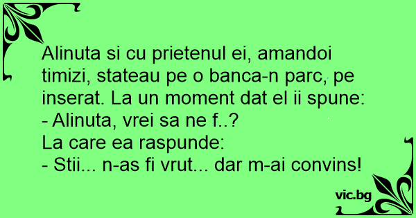 Alinuta si cu prietenul ei, amandoi timizi, stateau pe o banca-n parc, pe inserat. La un moment dat el ii spune: