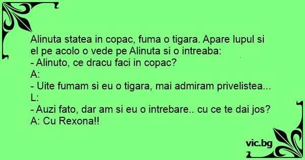 Alinuta statea in copac, fuma o tigara. Apare lupul si el pe acolo o vede pe Alinuta si o intreaba: