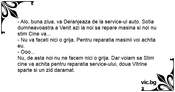 - Alo, buna ziua, va Deranjeaza de la service-ul auto. Sotia dumneavoastra a Venit azi la noi sa repare masina si noi nu stim Cine va...