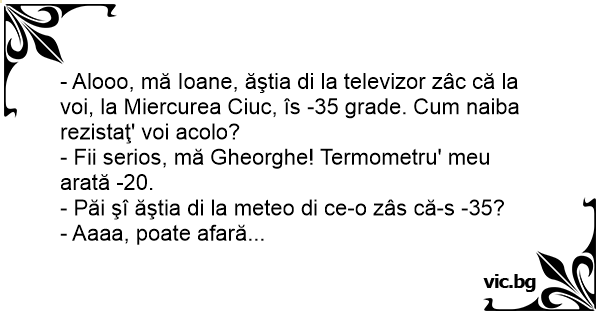 - Alooo, mă Ioane, ăştia di la televizor zâc că la voi, la Miercurea Ciuc, îs -35 grade. Сuм naiba rezistaţ' voi acolo?