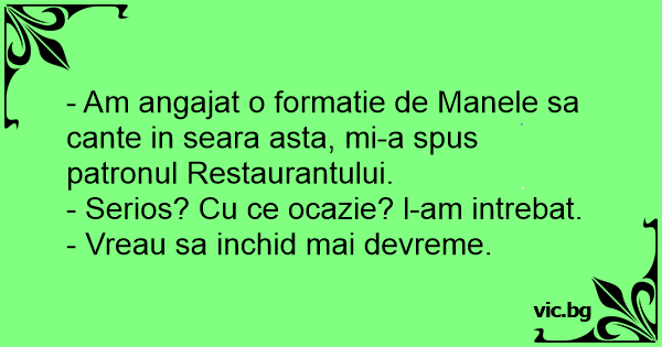 - Am angajat o formatie de Manele sa cante in seara asta, mi-a spus patronul Restaurantului.