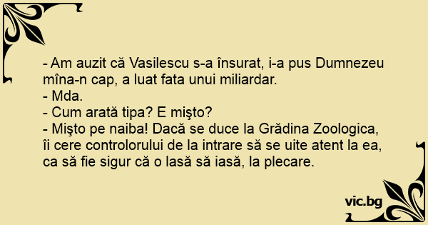 - Am auzit că Vasilescu s-a însurat, i-a pus Dumnezeu mîna-n cap, a luat fata unui miliardar.