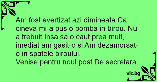 Am fost avertizat azi dimineata Ca cineva mi-a pus o bomba in birou. Nu a trebuit Insa sa o caut prea mult, imediat am gasit-o si Am dezamorsat-o in spatele biroului.