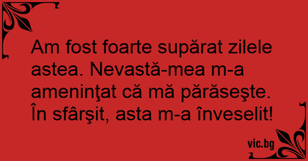 Am fost foarte supărat zilele astea. Nevastă-mea m-a ameninţat că mă părăseşte. În sfârşit, asta m-a înveselit!