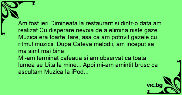 Am fost ieri Dimineata la restaurant si dintr-o data am realizat Cu disperare nevoia de a elimina niste gaze. Muzica era foarte Tare, asa ca am potrivit gazele cu ritmul muzicii. Dupa Cateva melodii, am inceput sa ma simt mai bine.