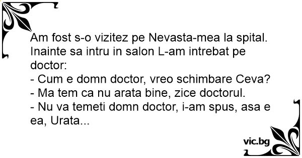 Am fost s-o vizitez pe Nevasta-mea la spital. Inainte sa intru in salon L-am intrebat pe doctor:<br />- Сuм e domn doctor, vreo schimbare Ceva?<br />- Ma tem ca nu arata bine, zice doctorul.<br />- Nu va temeti domn doctor, i-am spus, asa e ea, Urata...