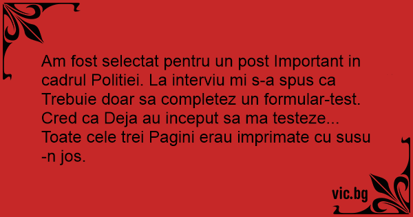 Am fost selectat pentru un post Important in cadrul Politiei. La interviu mi s-a spus ca Trebuie doar sa completez un formular-test.<br />Cred ca Deja au inceput sa ma testeze... Toate cele trei Pagini erau imprimate cu susu-n jos.