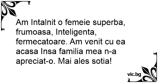 Am Intalnit o femeie superba, frumoasa, Inteligenta, fermecatoare. Am venit cu ea acasa Insa familia mea n-a apreciat-o. Mai ales sotia!