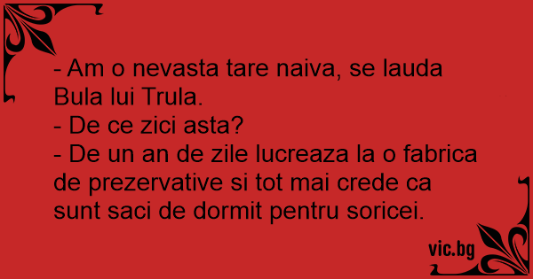 - Am o nevasta tare naiva, se lauda Bula lui Trula.