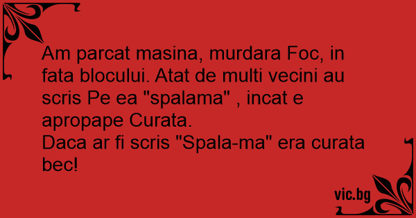 Am parcat masina, murdara Foc, in fata blocului. Atat de multi vecini au scris Pe ea "spalama" , incat e apropape Curata.