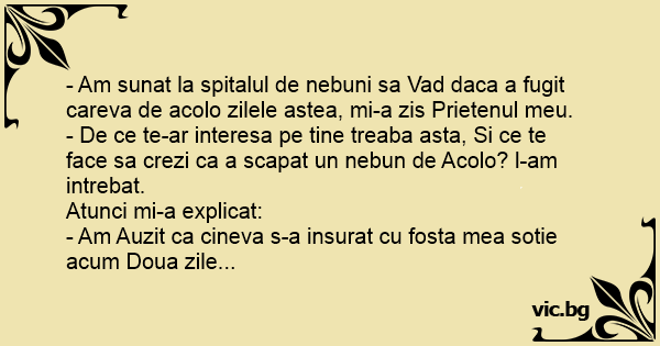 - Am sunat la spitalul de nebuni sa Vad daca a fugit careva de acolo zilele astea, mi-a zis Prietenul meu.