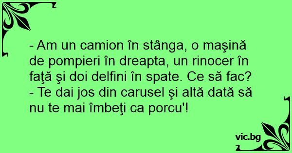 - Am un camion în stânga, o maşină de pompieri în dreapta, un rinocer în faţă şi doi delfini în spate. Ce să fac?