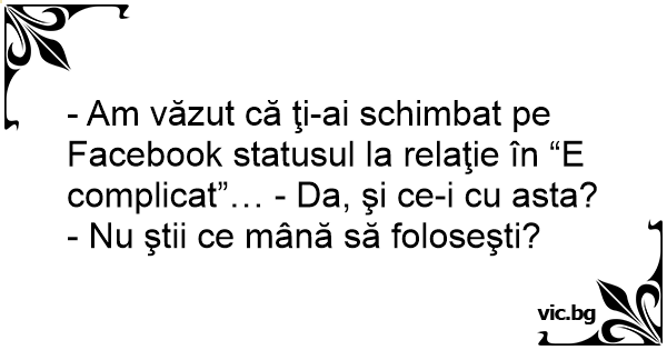 - Am văzut că ţi-ai schimbat pe Facebook statusul la relaţie în “E complicat”… - Da, şi ce-i cu asta?