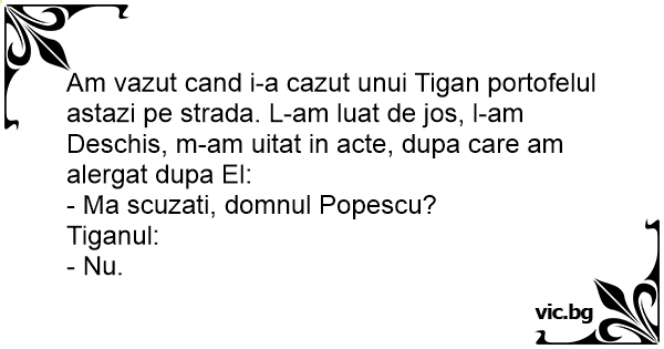 Am vazut cand i-a cazut unui Tigan portofelul astazi pe strada. L-am luat de jos, l-am Deschis, m-am uitat in acte, dupa care am alergat dupa El: