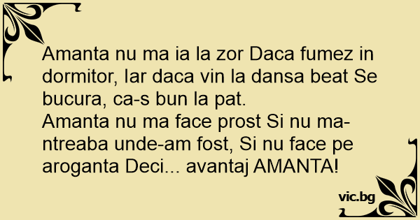 Amanta nu ma ia la zor Daca fumez in dormitor, Iar daca vin la dansa beat Se bucura, ca-s bun la pat.