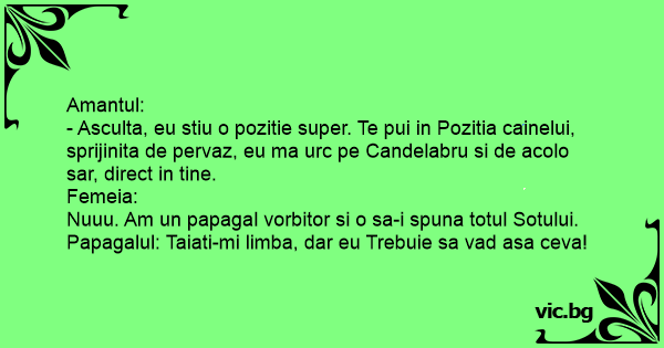 - Asculta, eu stiu o pozitie super. Te pui in Pozitia cainelui, sprijinita de pervaz, eu ma urc pe Candelabru si de acolo sar, direct in tine.
