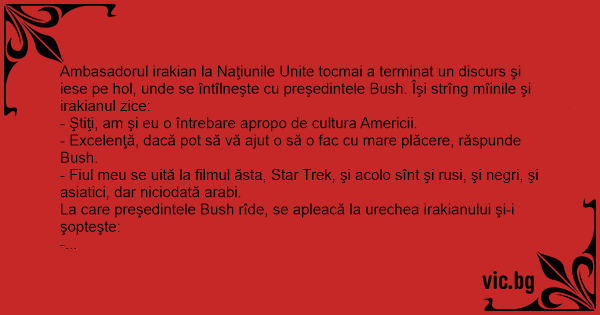 Ambasadorul irakian la Naţiunile Unite tocmai a terminat un discurs şi iese pe hol, unde se întîlneşte cu preşedintele Bush. Îşi strîng mîinile şi irakianul zice:
