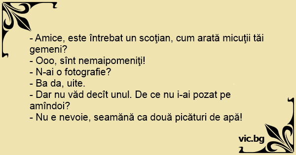 - Amice, este întrebat un scoţian, сuм arată micuţii tăi gemeni?