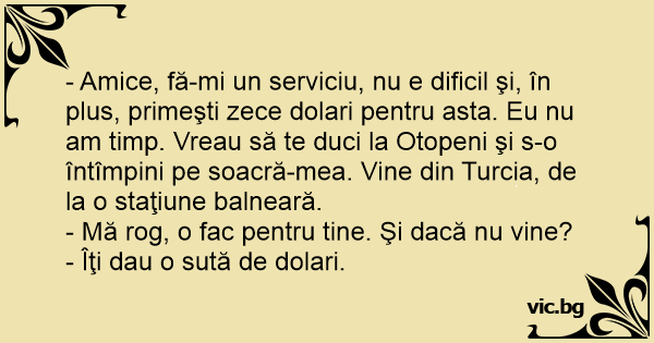 - Amice, fă-mi un serviciu, nu e dificil şi, în plus, primeşti zece dolari pentru asta. Eu nu am timp. Vreau să te duci la Otopeni şi s-o întîmpini pe soacră-mea. Vine din Turcia, de la o staţiune balneară.