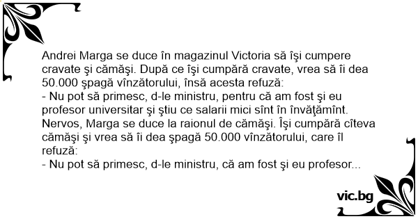 Andrei Marga se duce în magazinul Victoria să îşi cumpere cravate şi cămăşi. După ce îşi cumpără cravate, vrea să îi dea 50.000 şpagă vînzătorului, însă acesta refuză: