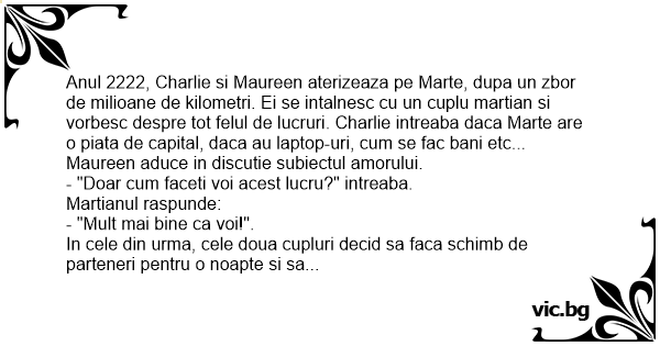 Anul 2222, Charlie si Maureen aterizeaza pe Marte, dupa un zbor de milioane de kilometri. Ei se intalnesc cu un cuplu martian si vorbesc despre tot felul de lucruri. Charlie intreaba daca Marte are o piata de capital, daca au laptop-uri, сuм se fac bani etc... Maureen aduce in discutie subiectul amorului.