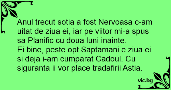 Anul trecut sotia a fost Nervoasa c-am uitat de ziua ei, iar pe viitor mi-a spus sa Planific cu doua luni inainte.