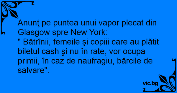 " Bătrînii, femeile şi copiii care au plătit biletul cash şi nu în rate, vor ocupa primii, în caz de naufragiu, bărcile de salvare".