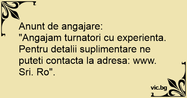 "Angajam turnatori cu experienta. Pentru detalii suplimentare ne puteti contacta la adresa: www. Sri. Ro".