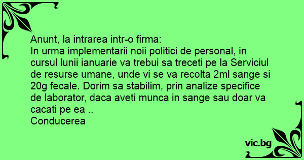 In urma implementarii noii politici de personal, in cursul lunii ianuarie va trebui sa treceti pe la Serviciul de resurse umane, unde vi se va recolta 2ml sange si 20g fecale. Dorim sa stabilim, prin analize specifice de laborator, daca aveti munca in sange sau doar va cacati pe ea ..