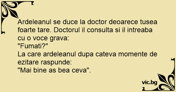 Ardeleanul se duce la doctor deoarece tusea foarte tare. Doctorul il consulta si il intreaba cu o voce grava: