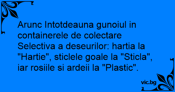 Arunc Intotdeauna gunoiul in containerele de colectare Selectiva a deseurilor: hartia la "Hartie", sticlele goale la "Sticla", iar rosiile si ardeii la "Plastic".