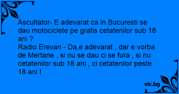 Radio Erevan - Da,e adevarat , dar e vorba de Mertane , si nu se dau ci se fura , si nu cetatenilor sub 18 ani , ci cetatenilor peste 18 ani !