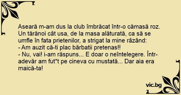 Aseară m-am dus la club îmbrăcat într-o cămasă roz. Un tărănoi cât usa, de la masa alăturată, ca să se umfle în fata prietenilor, a strigat la mine râzând: