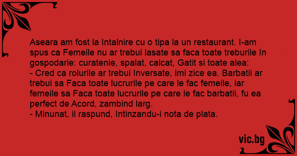 Aseara am fost la Intalnire cu o tipa la un restaurant. I-am spus ca Femeile nu ar trebui lasate sa faca toate treburile In gospodarie: curatenie, spalat, calcat, Gatit si toate alea:
