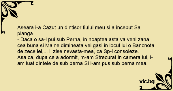 - Daca o sa-l pui sub Perna, in noaptea asta va veni zana cea buna si Maine dimineata vei gasi in locul lui o Bancnota de zece lei,... ii zise nevasta-mea, ca Sp-l consoleze.