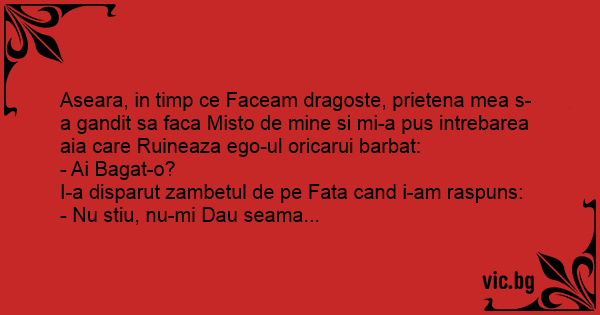 Aseara, in timp ce Faceam dragoste, prietena mea s-a gandit sa faca Misto de mine si mi-a pus intrebarea aia care Ruineaza ego-ul oricarui barbat: