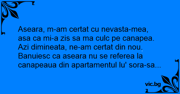 Aseara, m-am certat cu nevasta-mea, asa ca mi-a zis sa ma culc pe canapea.